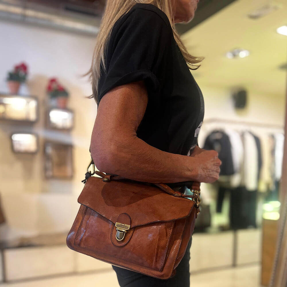 Bolso bandolera Aurora en piel de vacuno teñida en prenda.Teñido por pieza. Esta técnica única garantiza que cada bolso, pulsera o cinturón tenga tonos y reflejos de color únicos e irrepetibles. Este proceso presenta deliberadamente manchas debido al cepillado, que no deben considerarse defectos, sino resultados típicos de este método, lo que hace que cada creación Campomaggi sea única y exclusiva.