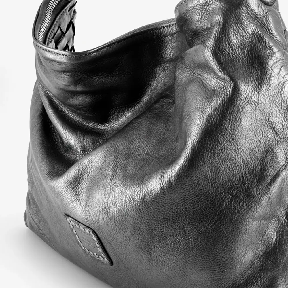 Atributos clave: Gris Metalizado | Piel | Compartimento principal único | Bolsillo interior con cremallera | Bolsillo interior para tarjetas | Correa de hombro extraíble a juego | Interior forrado | Exterior tejido | Parche con el logotipo y tachuelas doradas en la parte posterior | Detalles de herrajes dorados | Dimensiones y ajuste: 41 x 33 x 3 cm | Composición y cuidado: 100% cuero | Forro: 90% algodón, 10% cuero