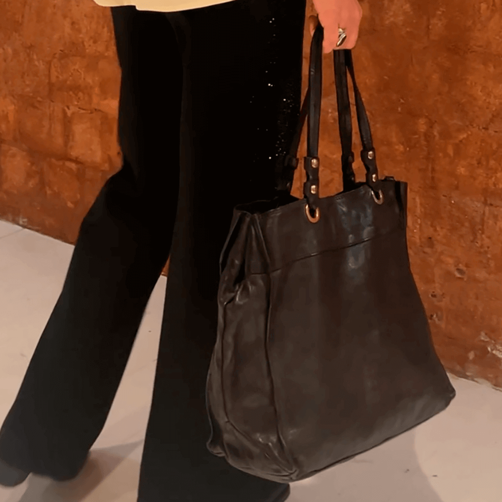 Shopper Dalia en piel de vacuno teñida en prenda de color burdeo.