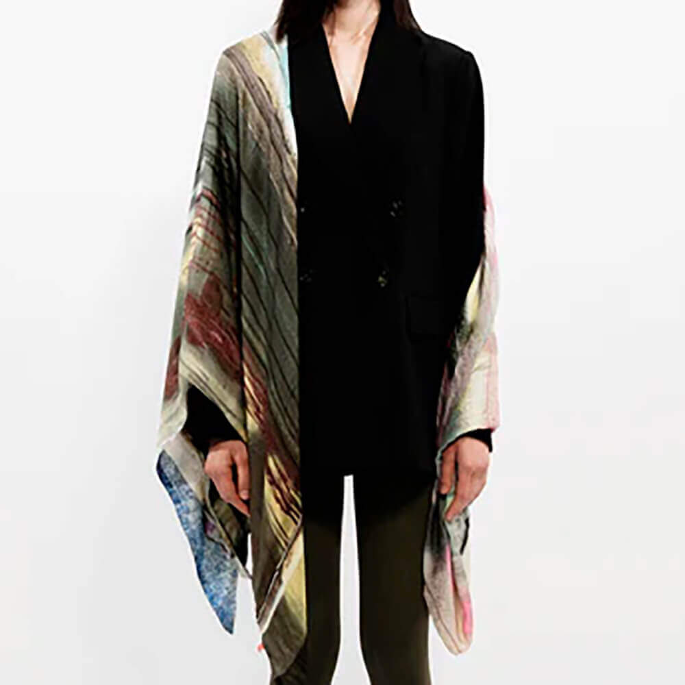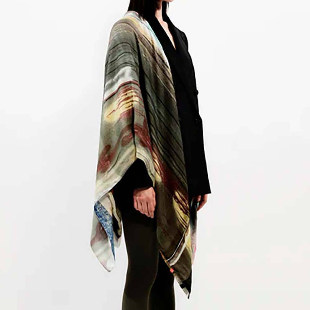 Fular cuadrado de doble cara, confeccionada en un tejido de seda/modal suave y fluido. A cada lado, una imagen auténtica impresa en alta resolución.
