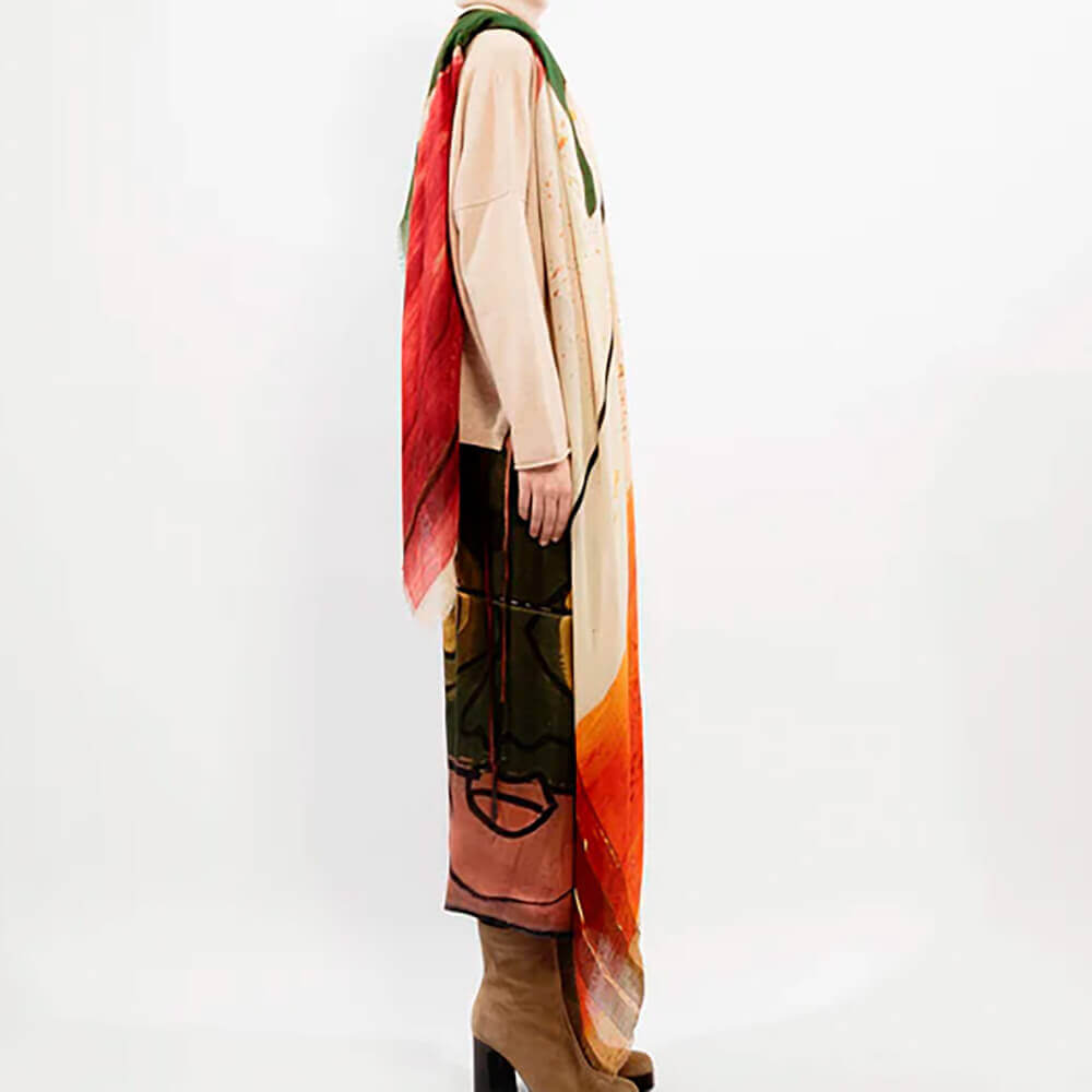 Fular cuadrado de una sola cara, confeccionada en un tejido de seda/modal suave y fluido con un estampado visual auténtico de alta resolución en toda la superficie.