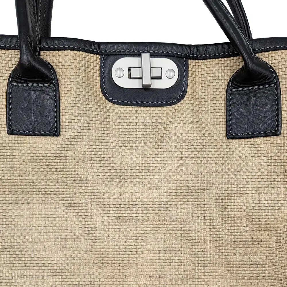 Confeccionado en straw (rafia) tejida de alta calidad y detalles en cuero auténtico, este bolso refleja la artesanía italiana característica de la marca. La combinación de tonos Black y Gray Tea —negro intenso con matices gris beige cálidos— crea un contraste moderno y versátil, perfecto tanto para outfits urbanos como para estilismos más elegantes.