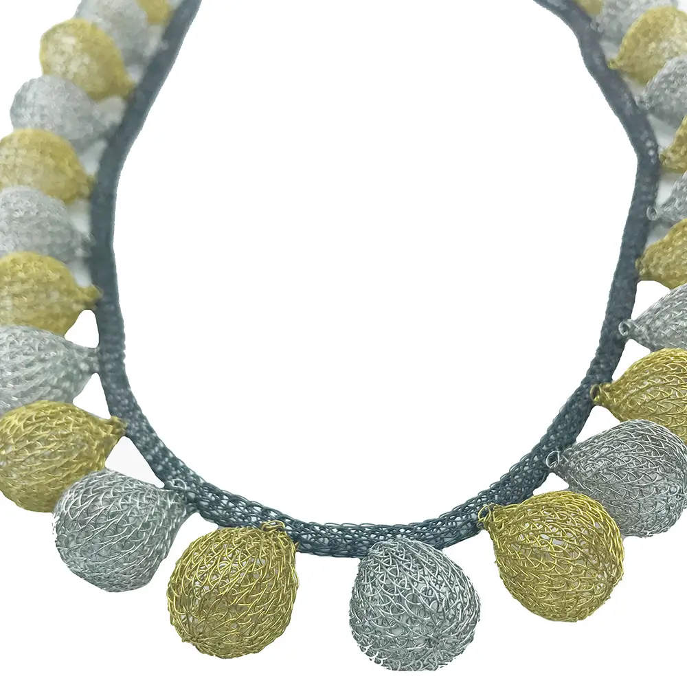 Gargantilla artesanal con cadena negra y borlas en oro y plata