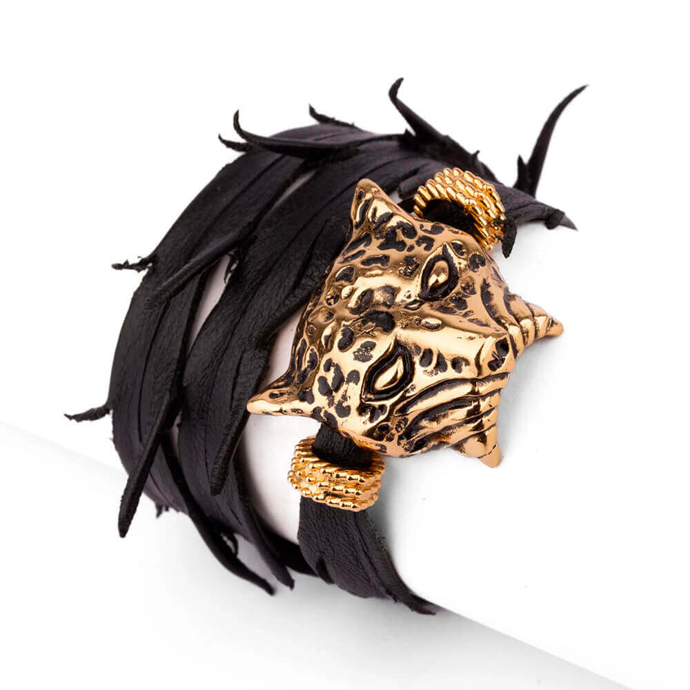 Pulsera de varias vueltas que combina modernidad y carácter. Su diseño envolvente culmina en una imponente cabeza dorada de jaguar, símbolo de poder y elegancia salvaje.