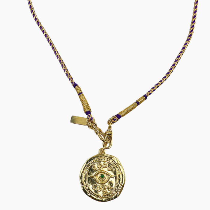Esta delicada y moderna gargantilla de hilo de color combina sencillez y significado en una joya única. Su dije dorado, elaborado en oro fino de 18 quilates, presenta un hermoso dibujo de ojo protector, símbolo de energía, protección y buena fortuna.