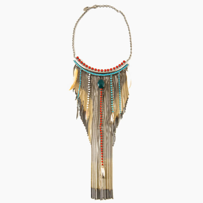 ¡Haz una declaración de estilo audaz con nuestra Gargantilla Flecos de Metal en tono dorado degradado! Esta impresionante pieza combina la elegancia del metal dorado con la belleza natural de la malaquita y la howlita teñida, engarzadas en puntas para un efecto verdaderamente llamativo.