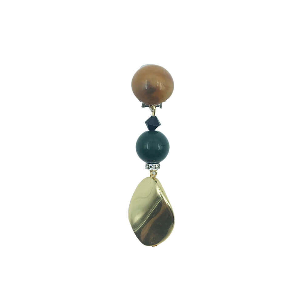 Estos pendientes de resina hechos a mano combinan elegancia y estilo moderno en una pieza única. Su diseño presenta un círculo superior en tono carey, un detalle central en verde y un colgante en color dorado que aporta un toque de luz y sofisticación. Con cierre de clip, resultan cómodos y perfectos para lucir sin necesidad de perforación. Ideales para dar un aire chic a cualquier conjunto, desde un look diario hasta una ocasión especial.