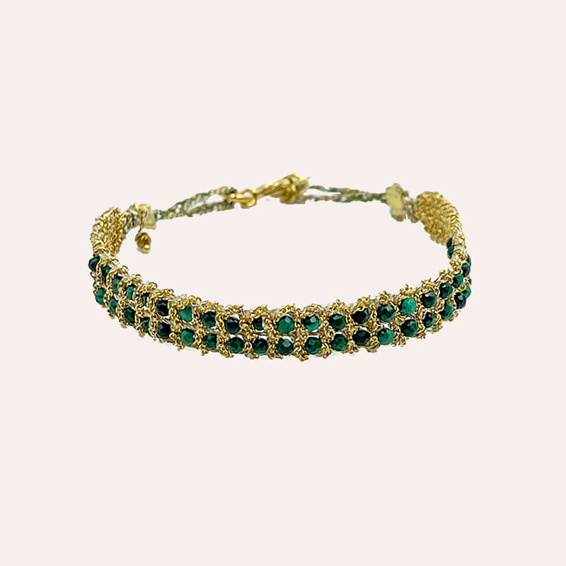 Pulsera Sun tejida a mano con hilo de plata 925 dorada, lurex y piedras Malaquita.