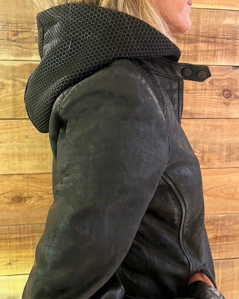 Chaqueta de piel negra con capucha modelo moto