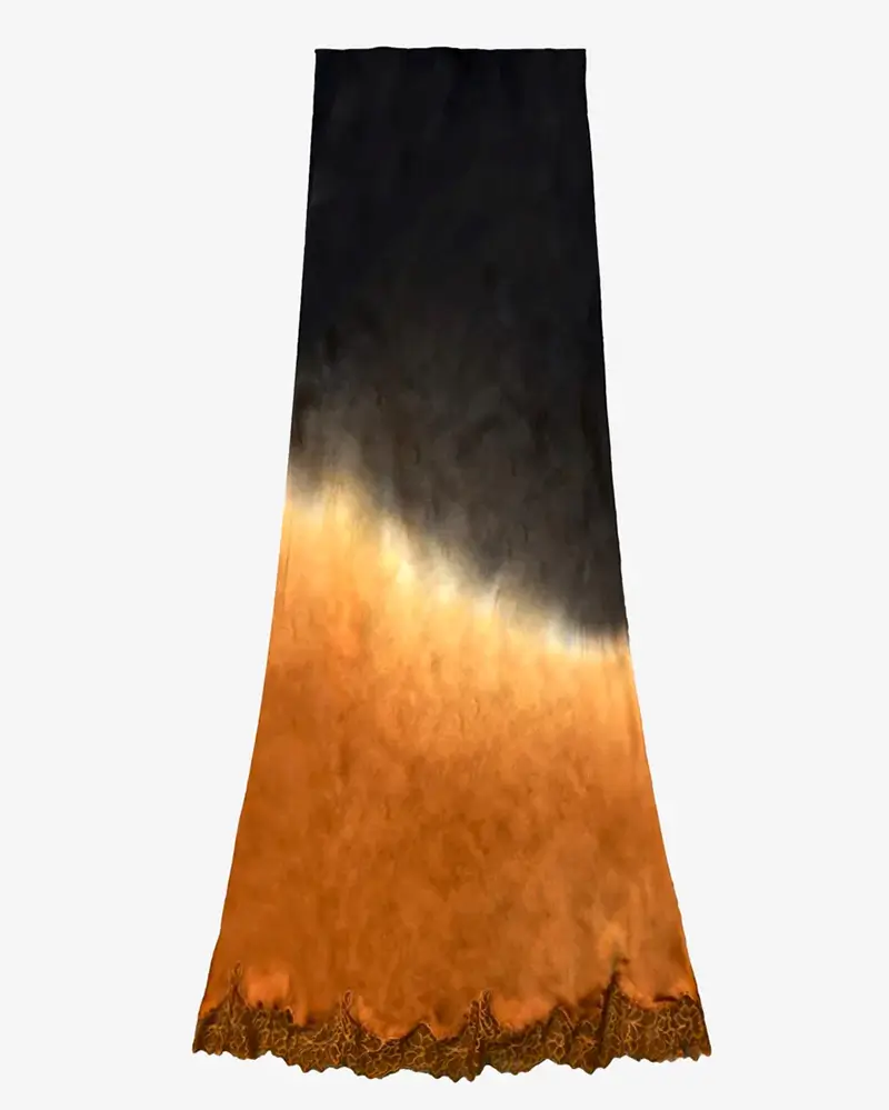 Su patrón diagonal, teñido a mano, revela un sutil degradado de azul y ocre, creando un efecto visual único y luminoso. Un delicado encaje tono sobre tono adorna el bajo, aportando un toque femenino y refinado a esta prenda con su encanto bohemio.
