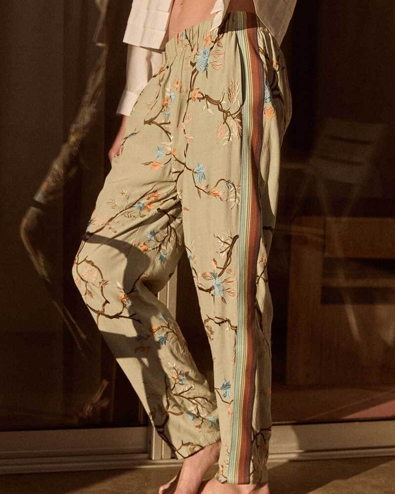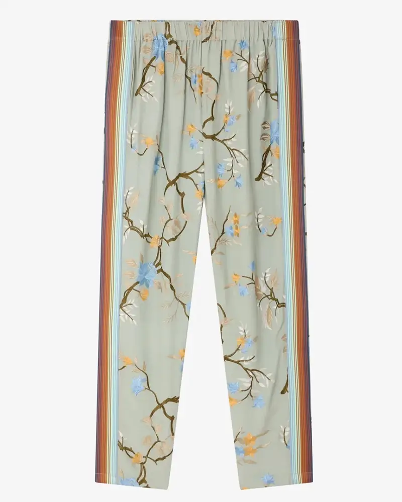 Pantalones rectos y fluidos de viscosa ligera bordada, adornados con un estampado floral multicolor sobre fondo azul claro. Las franjas de colores en los laterales definen la silueta y le aportan un toque deportivo y contemporáneo. La cintura elástica garantiza una comodidad óptima, mientras que los bolsillos laterales le dan un toque práctico. Su tejido flexible y su refinado estampado hacen de esta prenda una pieza a la vez relajada y elegante, ideal para combinar con una camisa fluida o una blusa de seda para un look bohemio-chic.