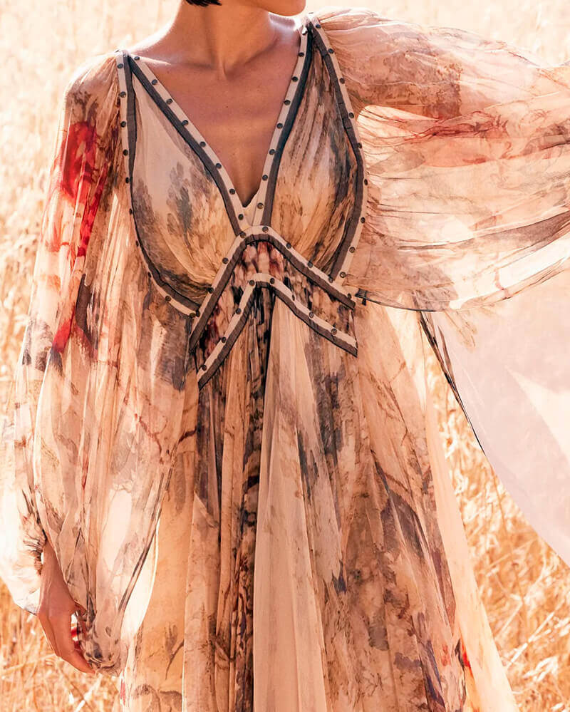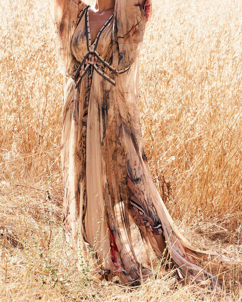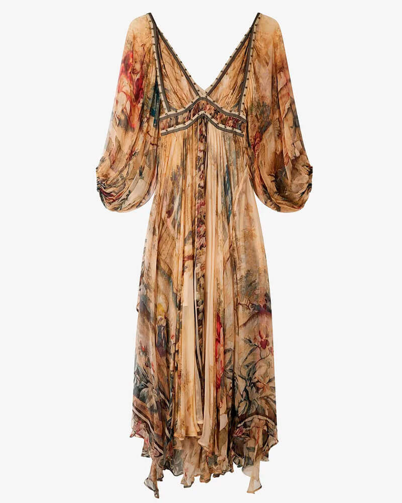 Este vestido largo de viscosa y gasa luce un estampado barroco sobre un fondo crudo, como una pintura en movimiento.