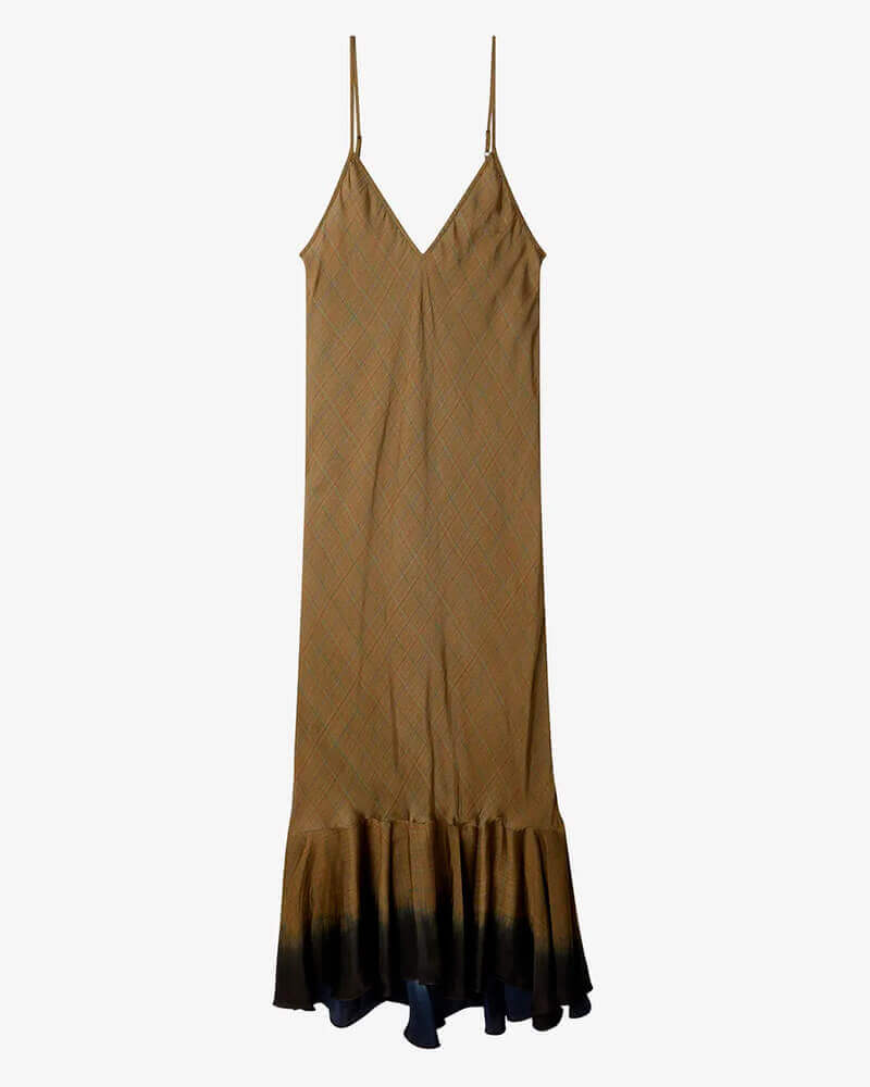 Vestido fluido de satén de viscosa, adornado con un juego de cuadros ingleses en tonos caqui que se oscurecen suavemente hasta un azul marino intenso en la parte inferior. Su corte recto se ajusta con ligereza, realzado por finos tirantes ajustables. La parte inferior del vestido se realza con un delicado volante que le aporta un movimiento ligero y un encanto poético.