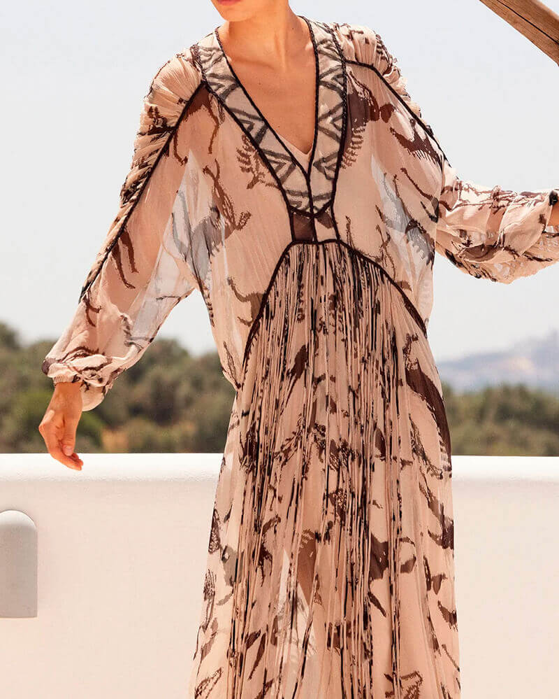 Vestido largo, ligero y fluido de gasa de viscosa, estampado con un patrón de inspiración prehistórica en una paleta de beige y marrón oscuro. Un trenzado acentúa las costuras, la parte superior de las mangas y los puños para un acabado refinado y artesanal. Desde el pecho, unos intrincados flecos tipo cordón caen por la parte delantera, aportando movimiento y un toque natural. El corte suave acompaña con naturalidad los movimientos. Una pieza expresiva y única.